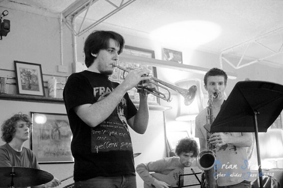 An evening of Jazz at the Front Cafe and Gallery featuring the Reuben Lewis Quintet (Reuben Lewis - trumpet; Max Williams - tenor saxophone; Matt Lustri - guitar; Simon Milman - bass; Aidan Lowe - drums) --- Lyneham, Canberra, ACT
