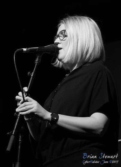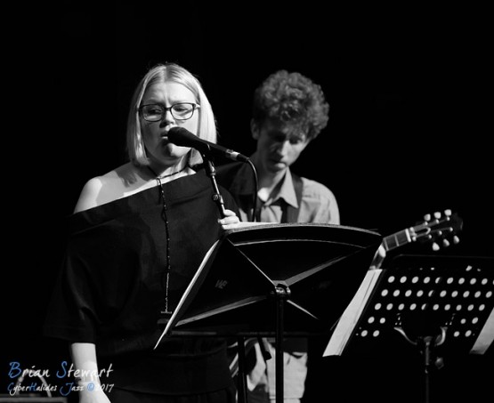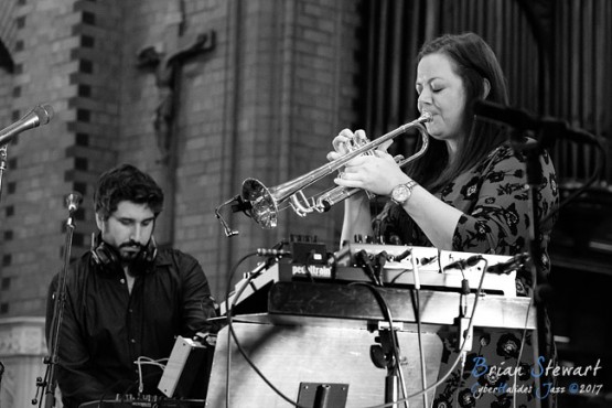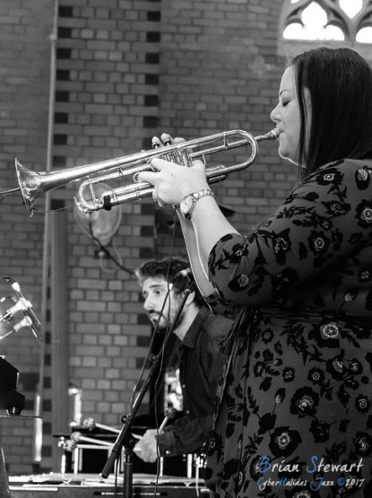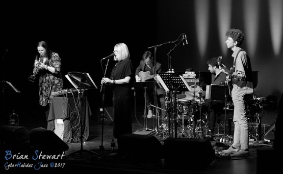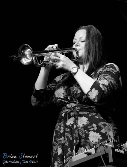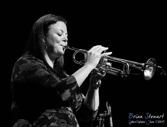 The Nadje Noordhuis Quintet (Nadje Noordhuis - trumpet; James Shipp - drums; Gian Slater - vocals; Chris Hale - bass; Theo Carbo - guitar) performing in the WPAC Theatre at the 2017 Wangaratta Festival of Jazz
