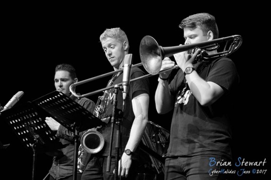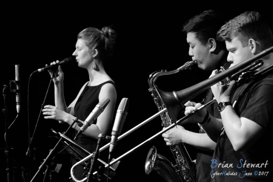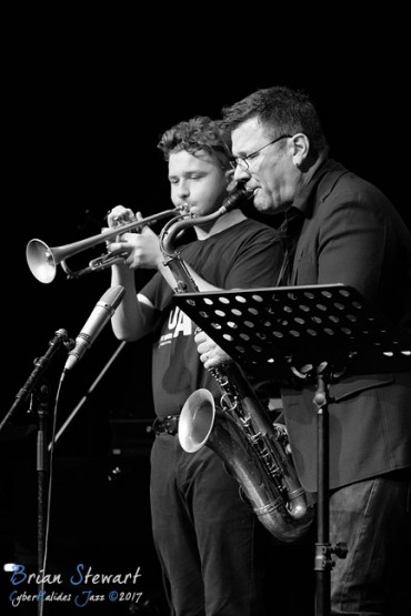 The Monash Sessions (Tony Gould - piano; Mike Nock - piano; Rob Burke - sax; Paul Williamson - trumpet; Monash University students) performing in the WPAC Theatre at the 2017 Wangaratta Festival of Jazz
