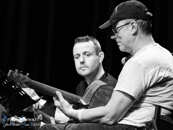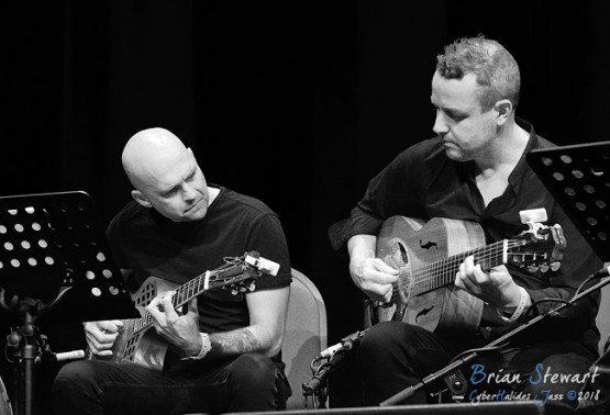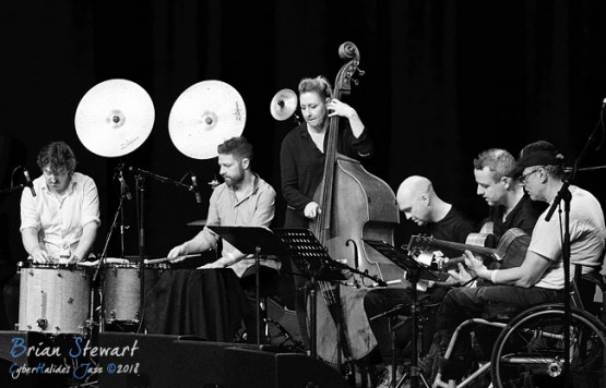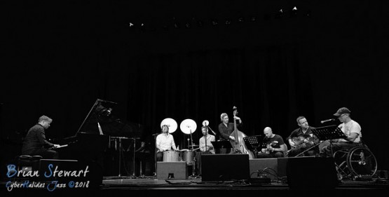 The Ben Hauptmann Acoustic Ensemble (Ben Hauptmann - guitar; Arne Hanna - guitar; Franco Raggatt - guitar; Harry Sutherland - piano; Zoe Hauptmann - bass; James Hauptmann - drums; Evan Mannell - percussion) performing in the WPAC Theatre at the 2018 Wangaratta Festival of Jazz