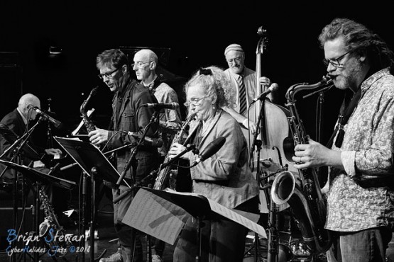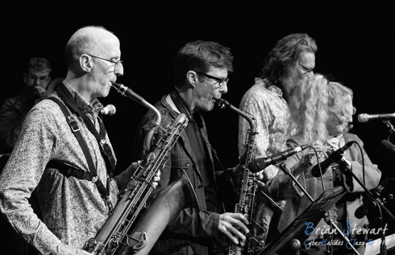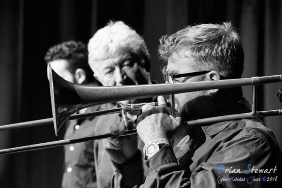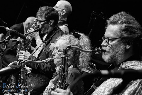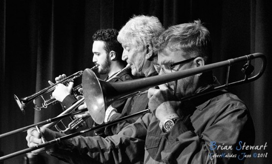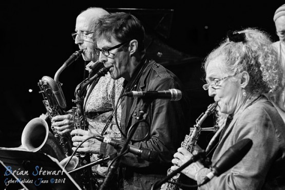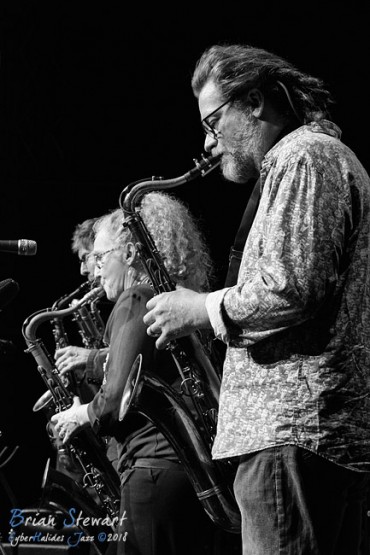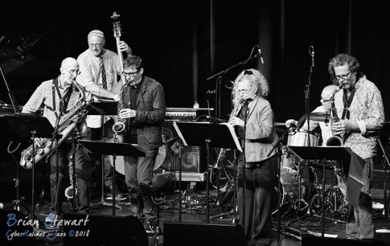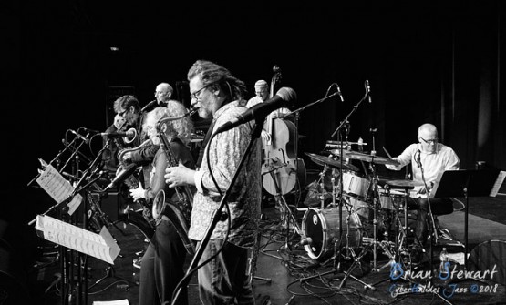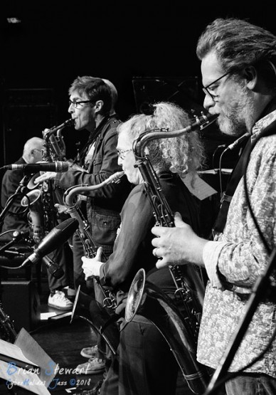 Ten Part Invention (Miroslav Bukovsky - trumpet/musical director; Sandy Evans - saxophones/musical director; Andrew Robson - saxophones; Paul Cutlan - saxophones; John Mackey - saxophones; Thomas Avgenicos - trumpet; James Greening - trombone; Paul McNamara - piano; Steve Elphick - bass; Dave Goodman - drums) performing in the WPAC Theatre at the 2018 Wangaratta Festival of Jazz